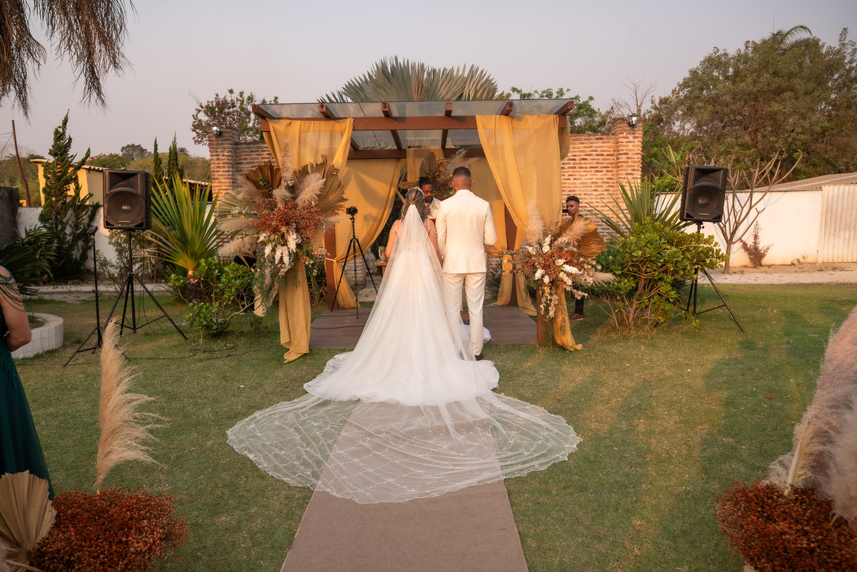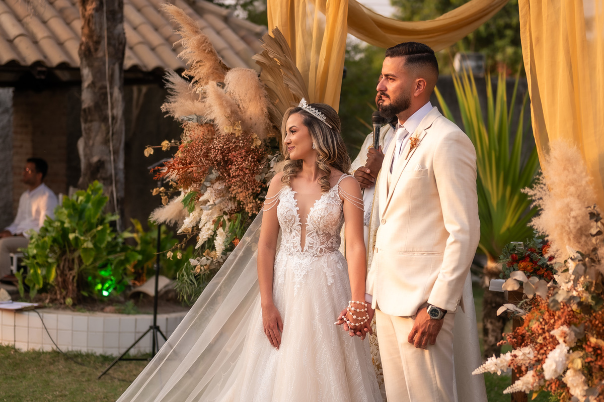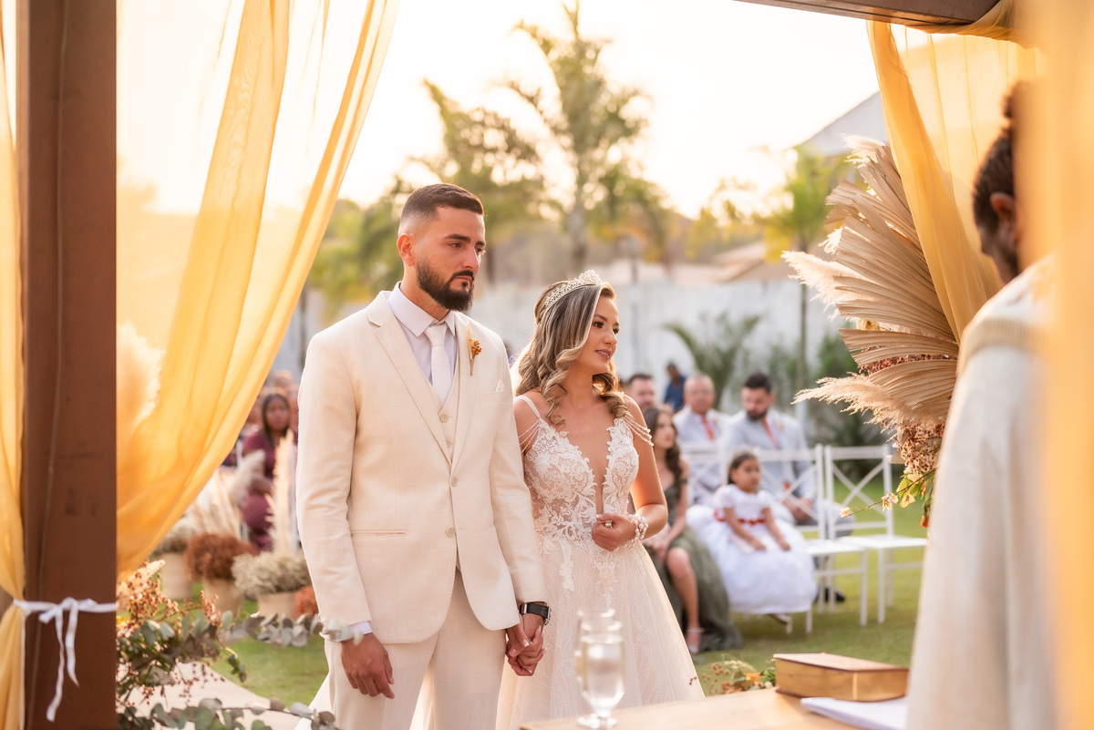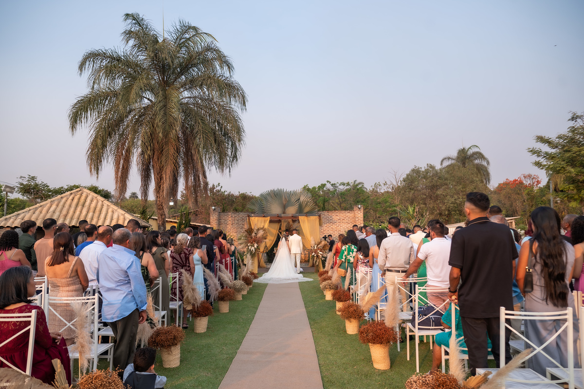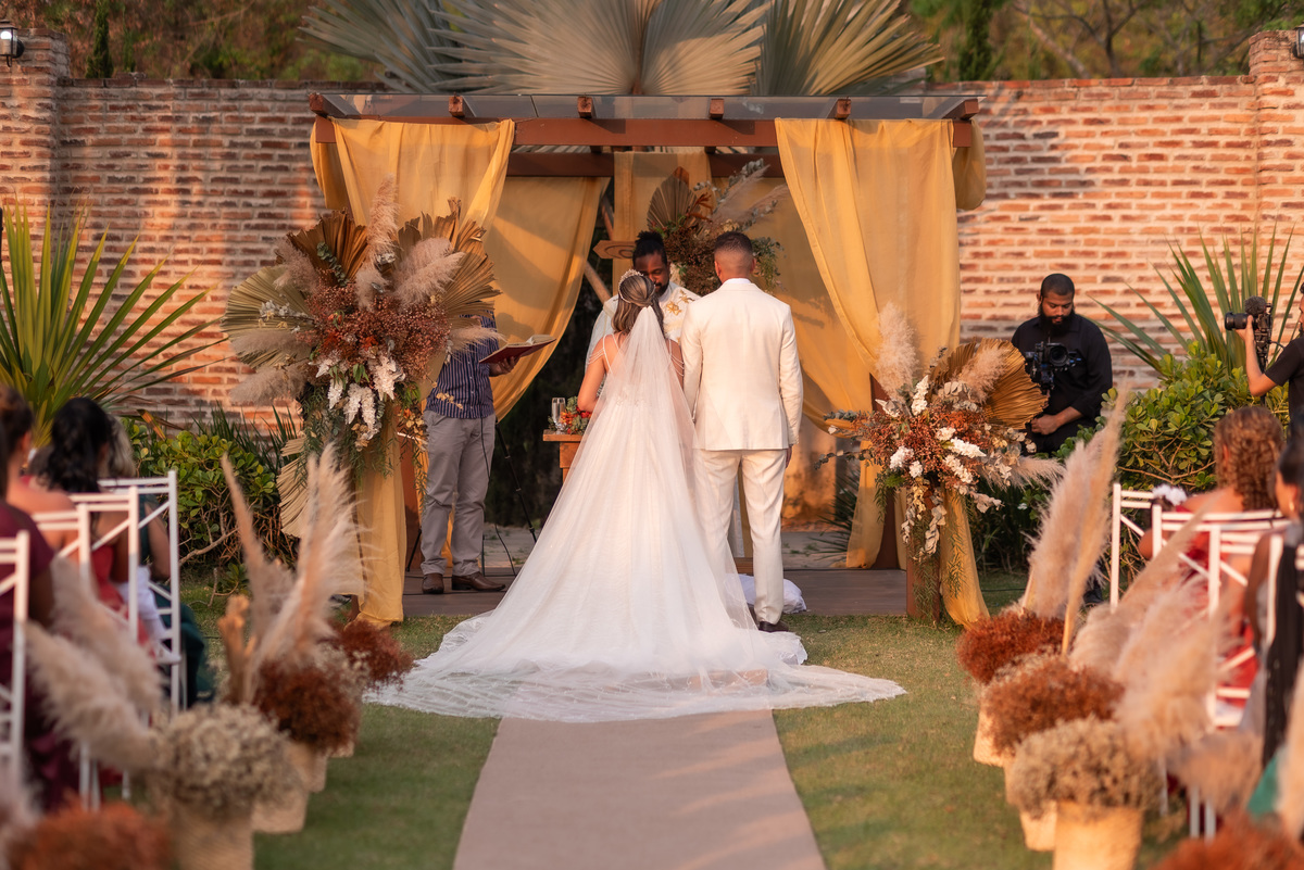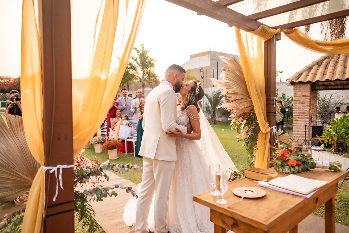 A cerimônia contou com a presença de amigos e familiares, criando um clima de emoção e felicidade do início ao fim. O pôr do sol no Espaço Araújo deu um toque mágico às fotos do casal, que aproveitaram todos os cantinhos do local para registrar esse momento especial.