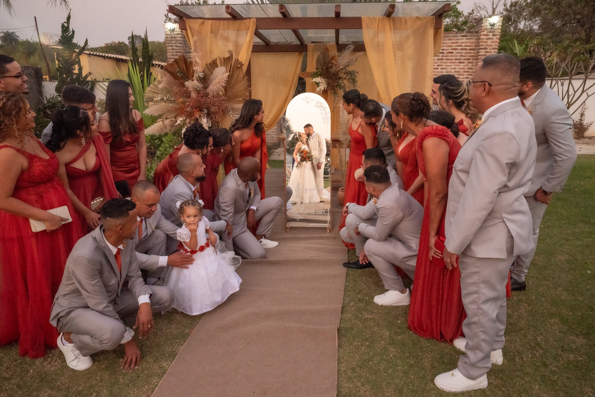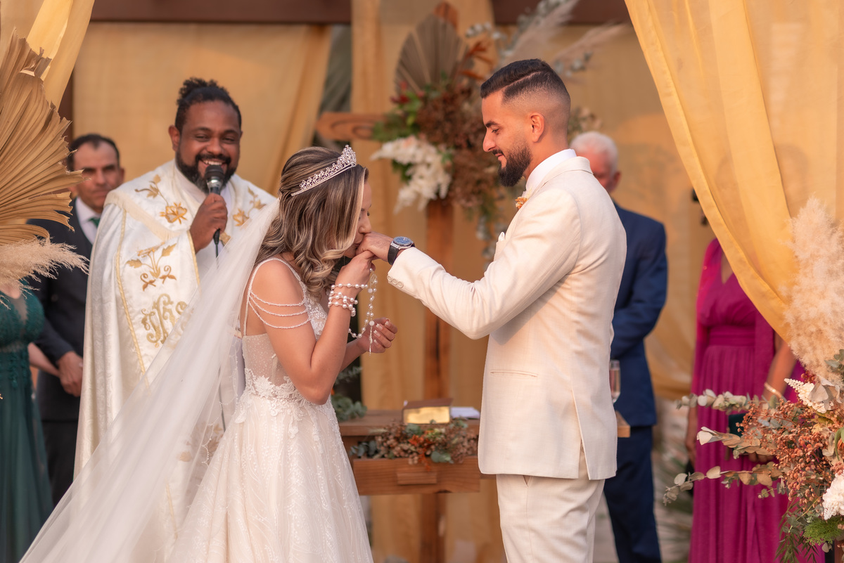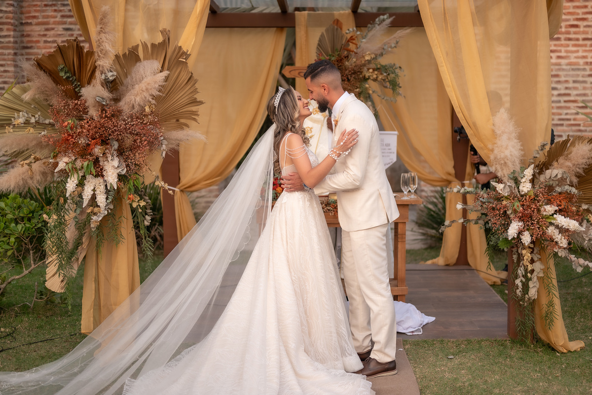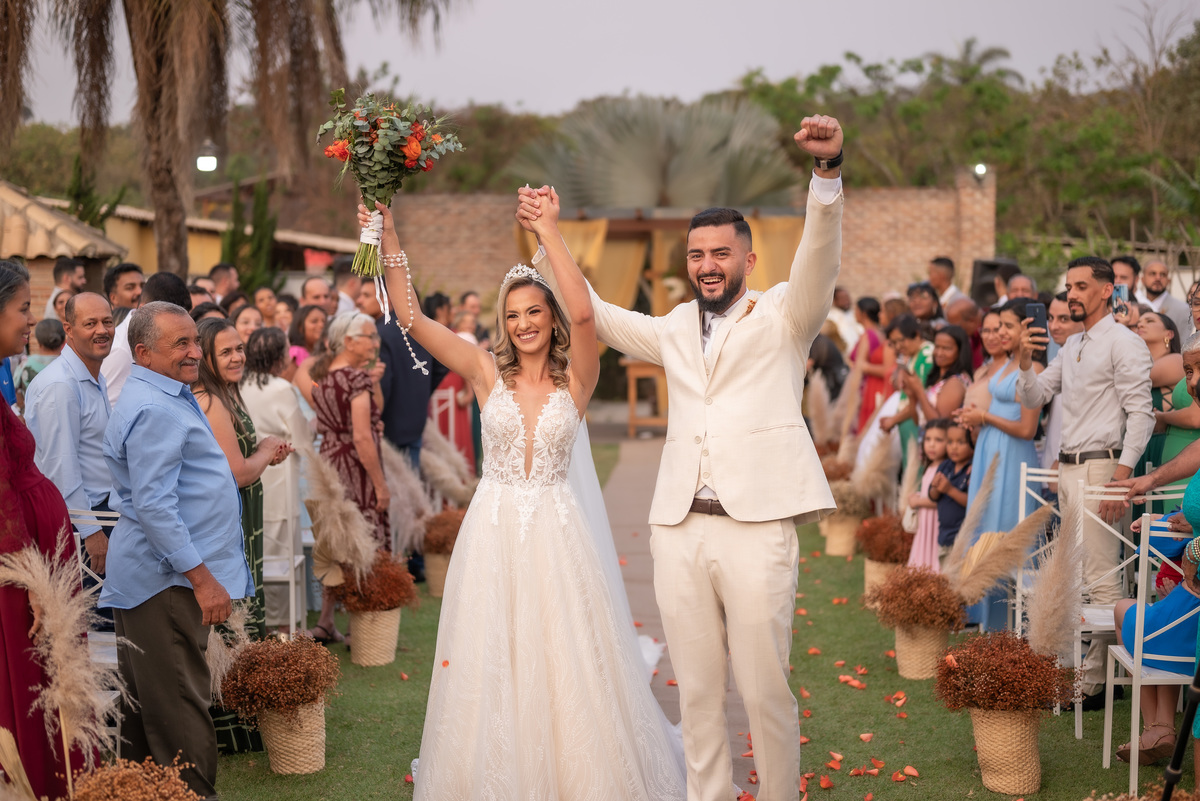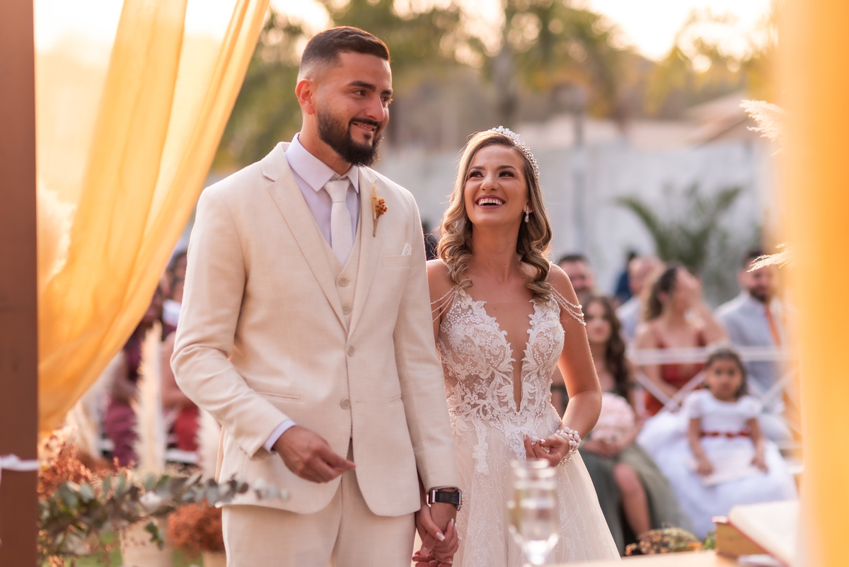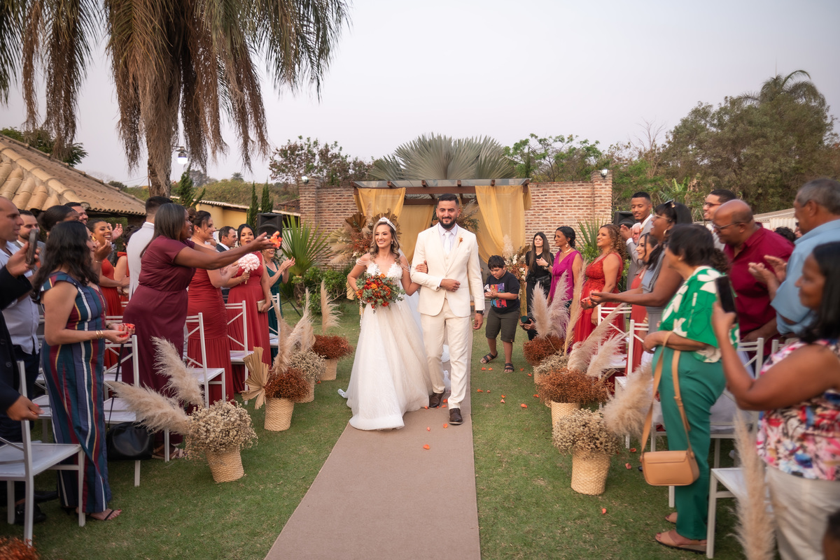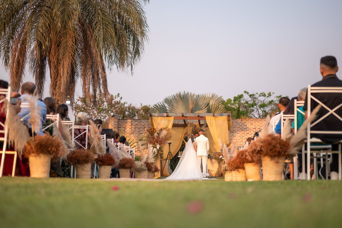 A cerimônia contou com a presença de amigos e familiares, criando um clima de emoção e felicidade do início ao fim. O pôr do sol no Espaço Araújo deu um toque mágico às fotos do casal, que aproveitaram todos os cantinhos do local para registrar esse momento especial.